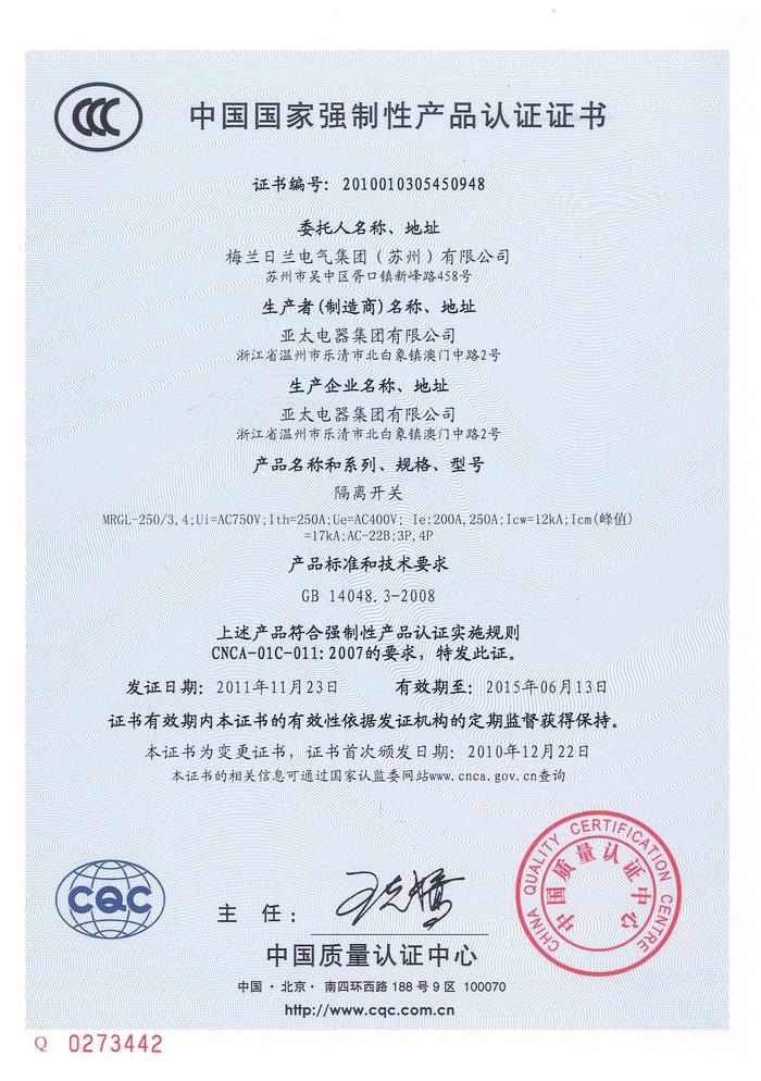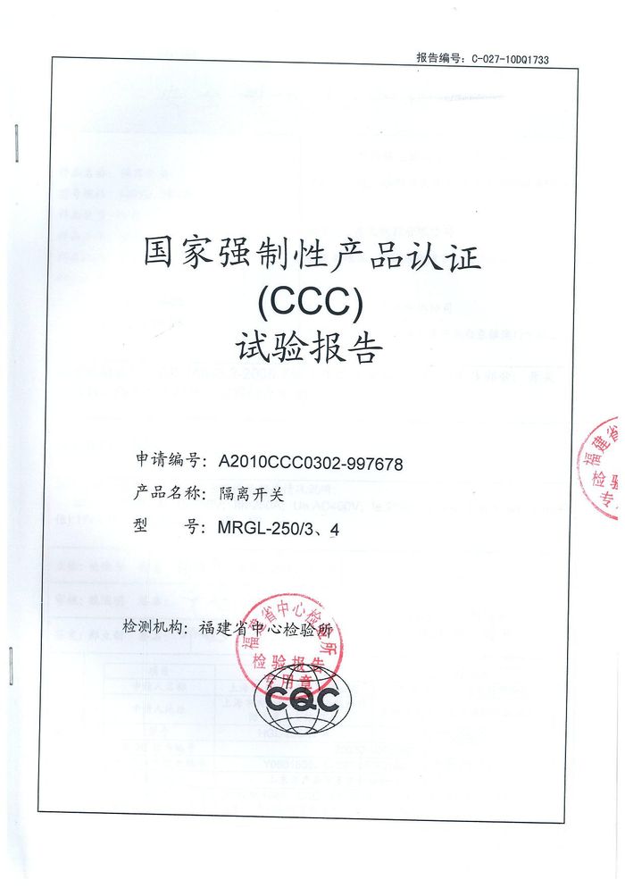 MRGL-250隔離開關(guān)資質(zhì)證書