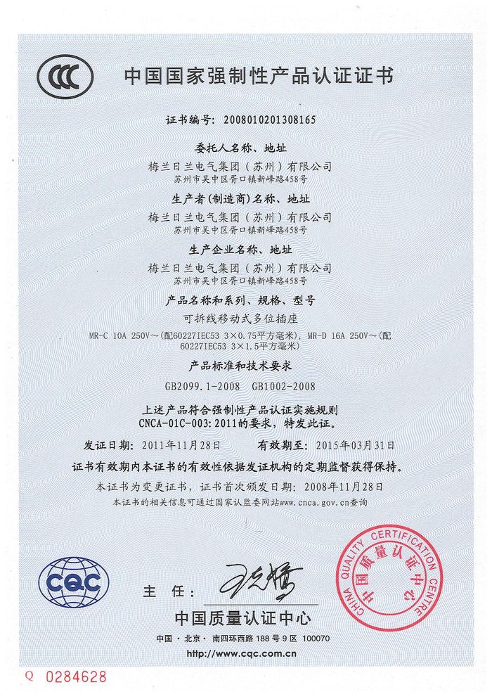 MR-C排插資質(zhì)證書