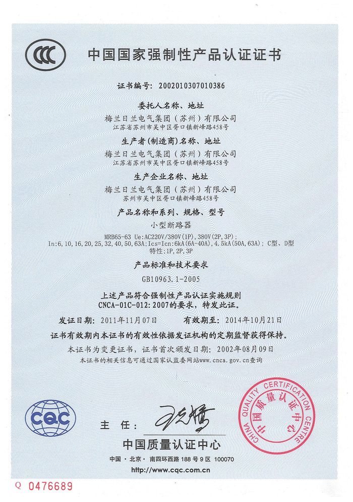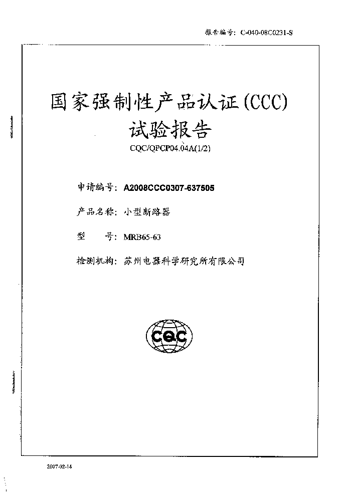 MRB65-63小型斷路器資質證書