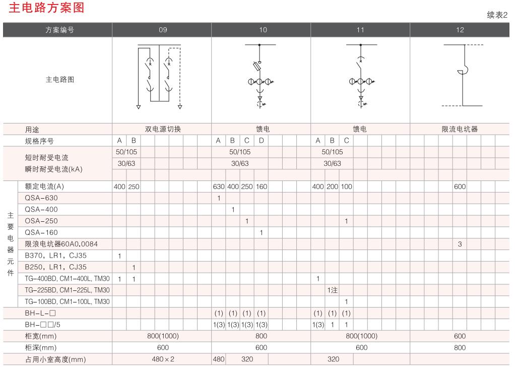開關(guān)設(shè)備主電路方案共32組118個(gè)規(guī)格(見表2).不包括由于輔助電路的控制與保護(hù)的變化而派生的方案和規(guī)格。包括了發(fā)電、供用電和其它電力用戶的需要,額定工作電流為4000A,適合2500kVA及以下的配電變壓器選用。